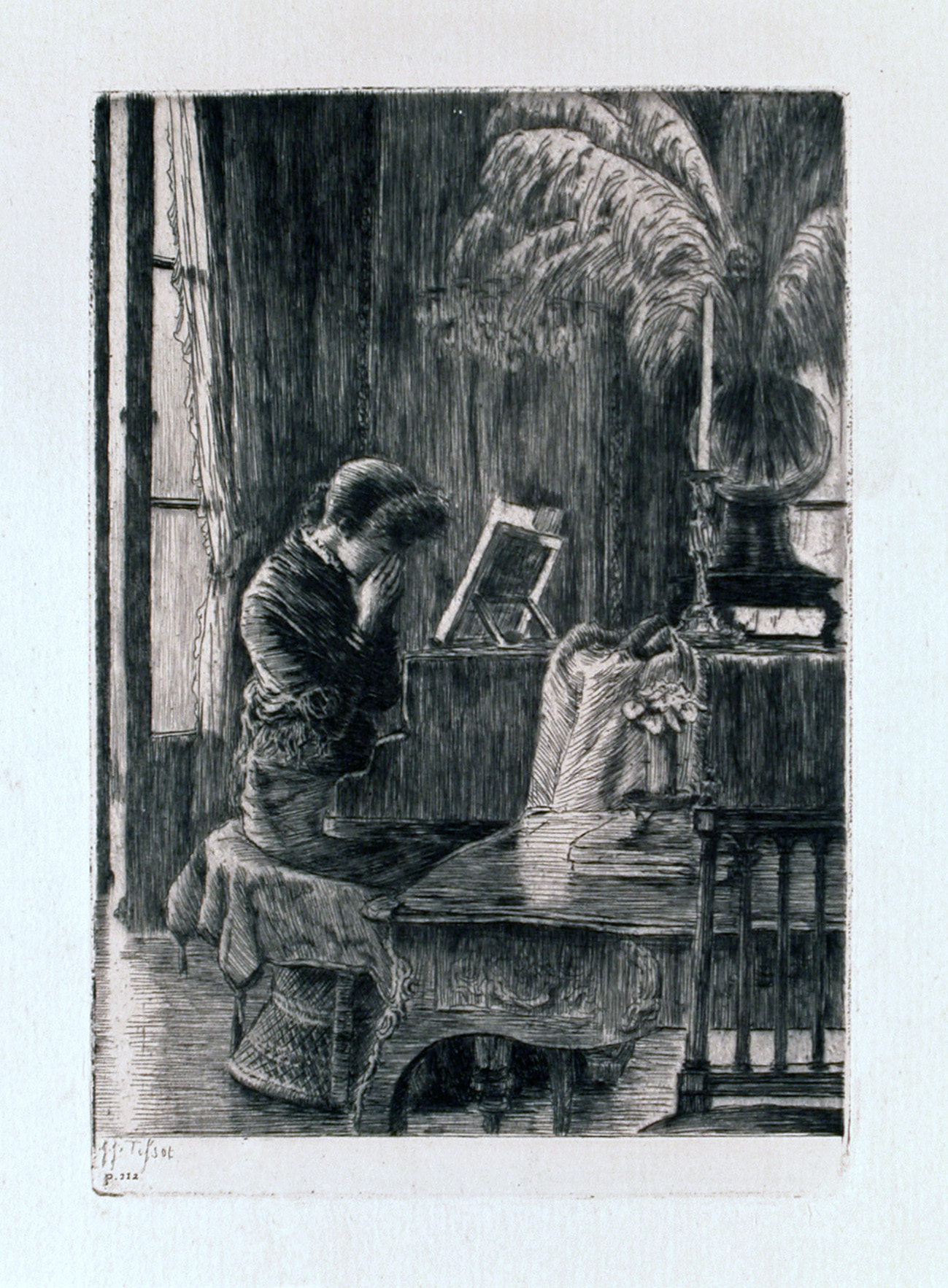 | Renee Crying at Piano Framed Etching by James Tissot |